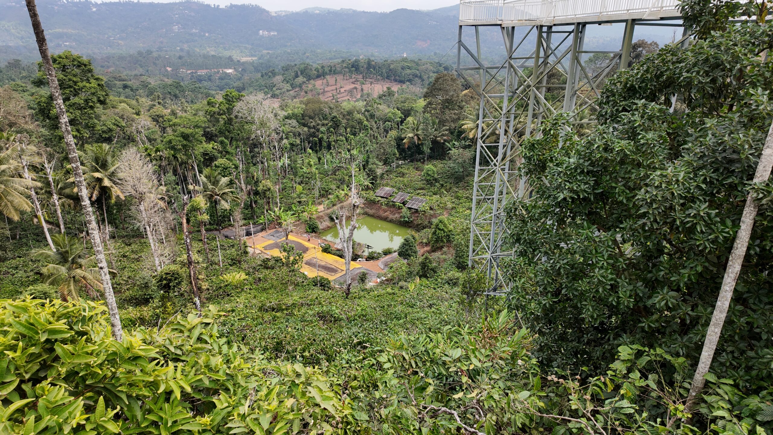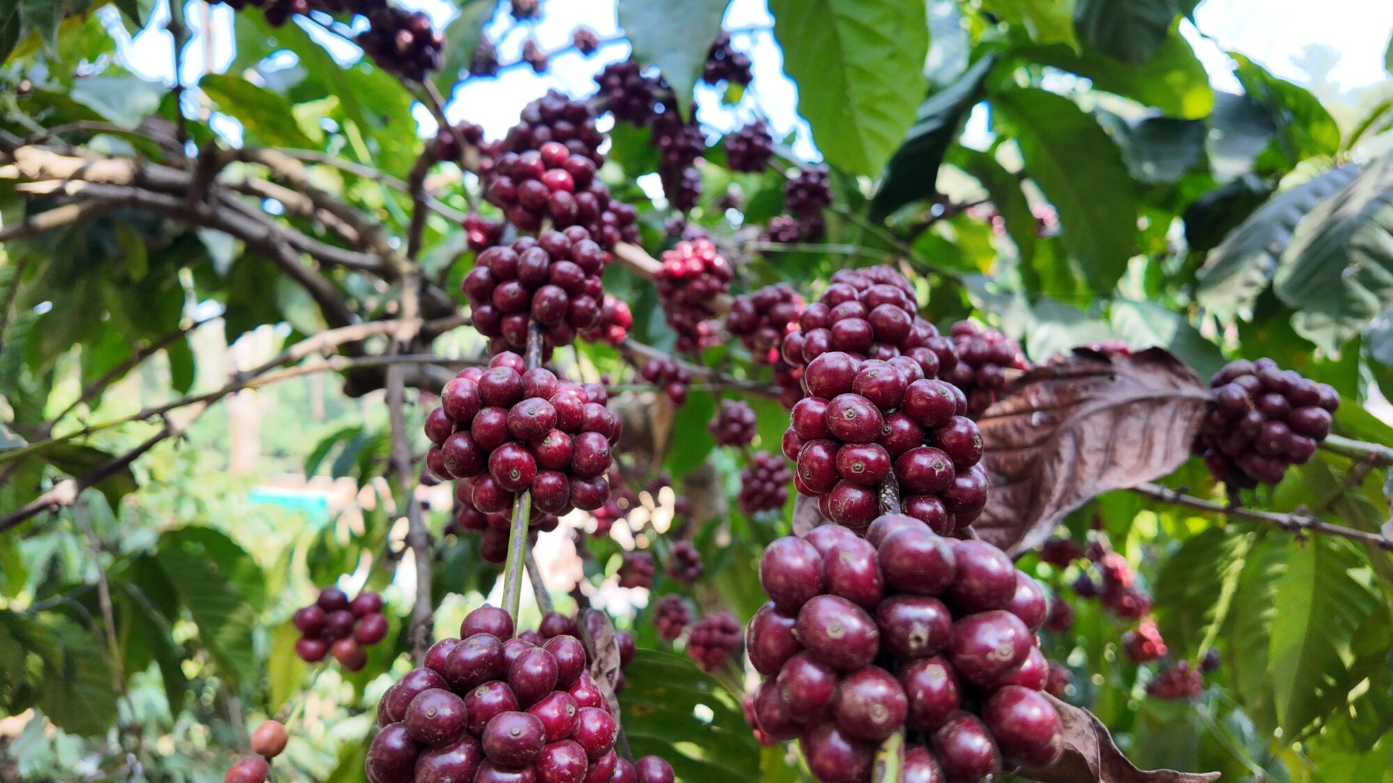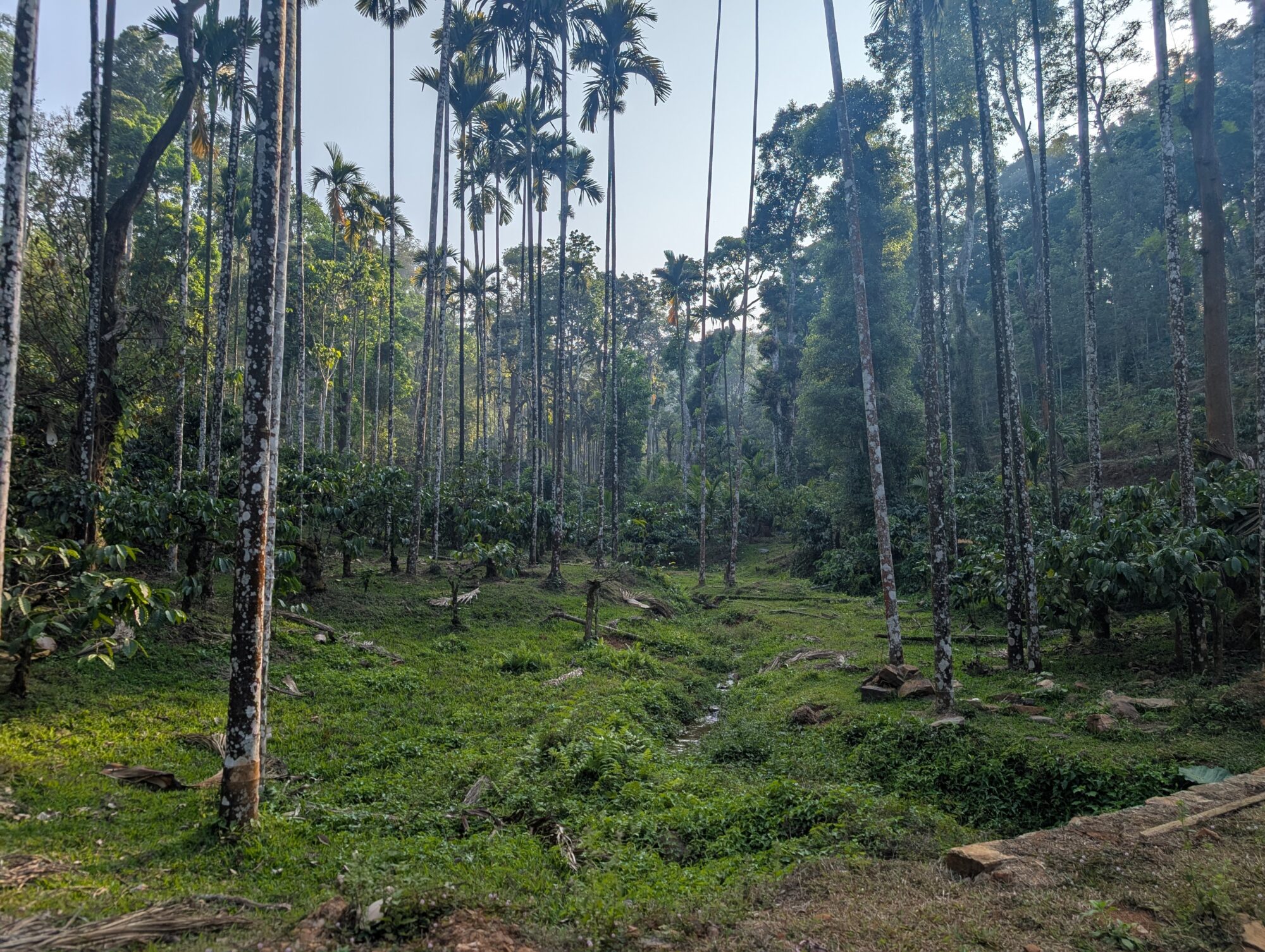そこでは、インド独特の「2段階シェード」と言われる農法で、5mくらいの中木と20m以上の大木が、重なり合って強い日差しからコーヒーの木を守っています。農園の中に入ると、鳥の鳴き声や熟した果物が落ちる音、姿は見えずとも野生動物の気配を感じるガサガサという音が聞こえてきます。シェードツリーの管理もなされていて、心地よい風が吹き抜ける、気持ちの良い環境です。