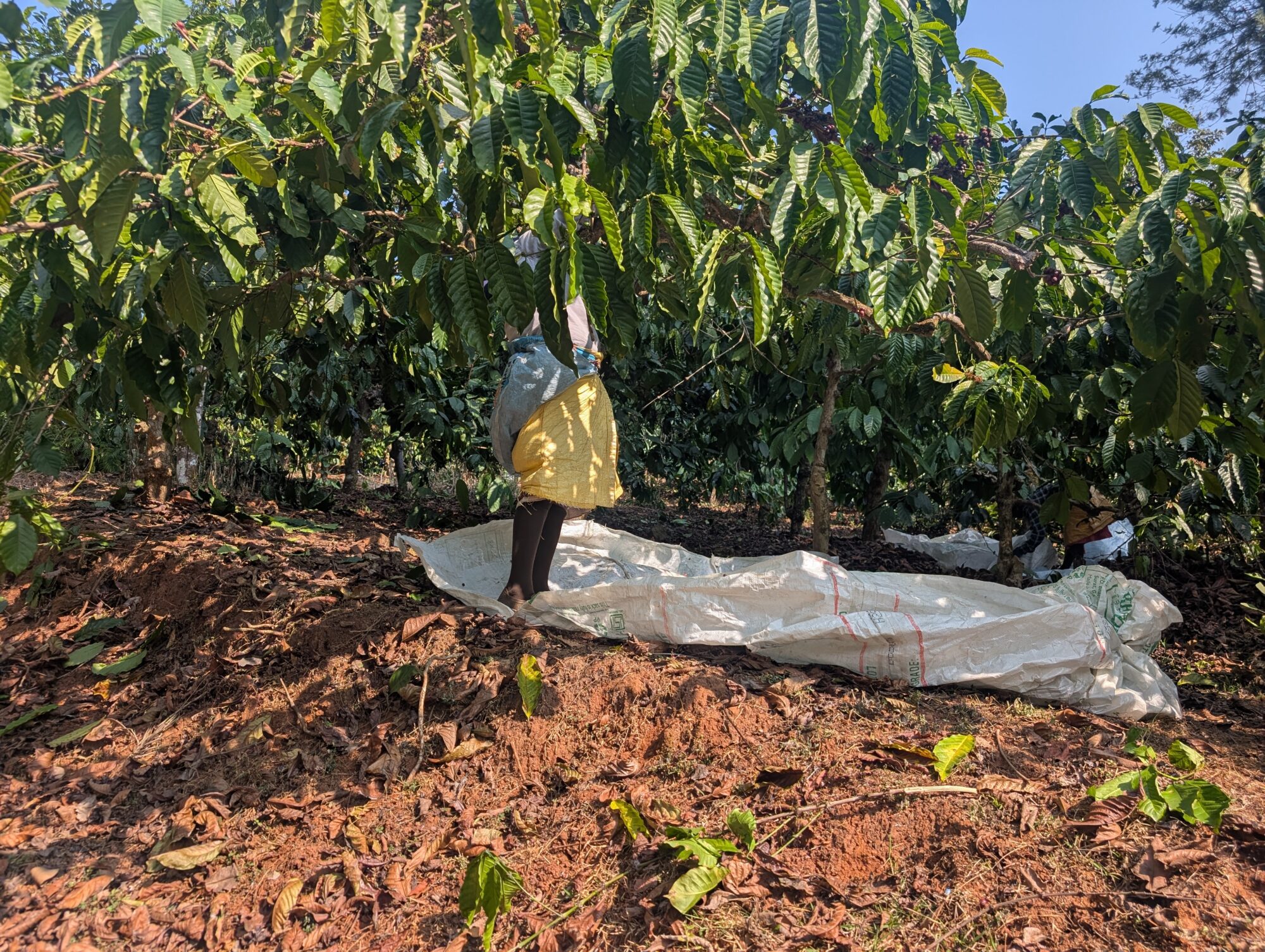 コーヒーチェリーを摘み取るピッカーさんは収穫期になると30世帯くらいが住み込みで来てくれるようで、各世帯ごとに朝の7時からお昼過ぎまで収穫作業に入ります。ロブスタはアラビカに比べると一斉に開花して成長するので熟度が揃いやすく、「今日はこの区画で収穫する」と決めるなど、管理がしやすそうでした。