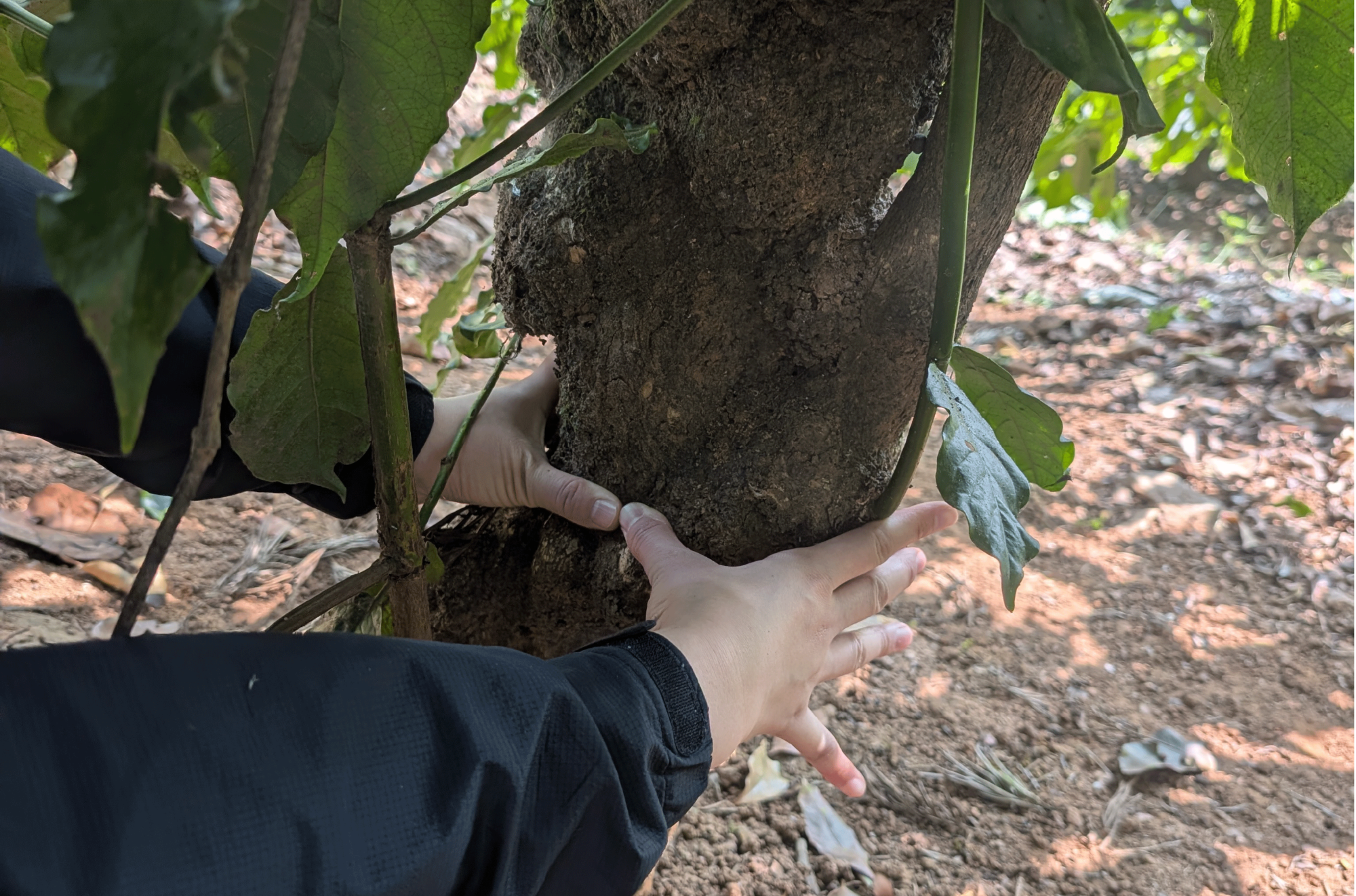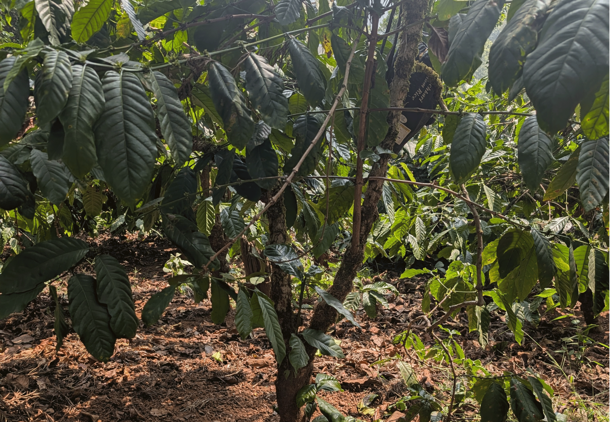 これまでエチオピアやインドネシアなど、各地でコーヒーの木を見てきましたが、インドの、中でもロブスタの幹が太いのなんの。両掌では収まらないくらいの太さです。