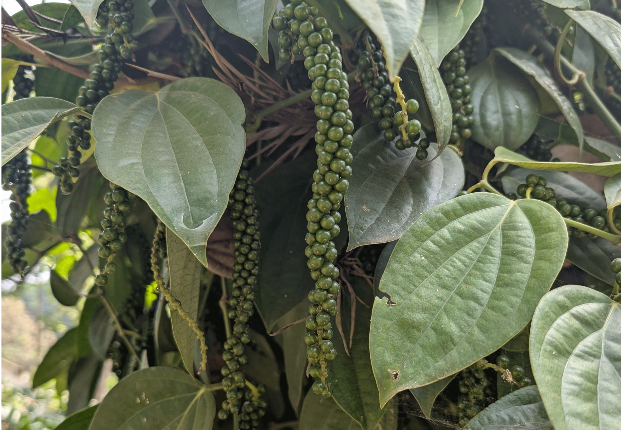 また、シェードツリーにはツタが絡んでいて、よく見るとコショウの実がなっていました。スパイスも一緒に育てているあたりはさすがインドといったところですね。お土産にパパクチ農園産のコショウを頂いてきました。