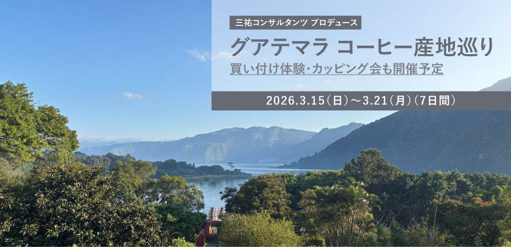 今回の企画は、海ノ向こうコーヒーに加え、現在 JICA(独立行政法人国際協力機構)のプロジェクトの一環として共に活動している三祐コンサルタンツさん、そしてグアテマラ国内で精力的に活動しているコーヒー団体 ANACAFE(全国コーヒー協会)さんとの共同催行です。生産者を訪ねながら、水洗工場やドライミルの見学、収穫体験・精選体験を行うほか、アティトラン湖周辺の観光地巡りや、アンティグアの美しい街並み散策、アゾテア農園が運営するコーヒー博物館の訪問など、グアテマラとコーヒーの魅力を存分に楽しめる内容となっています。最後には、ANACAFE さんのオフィスにてカッピングを行い、コーヒーの買い付けも可能です。
